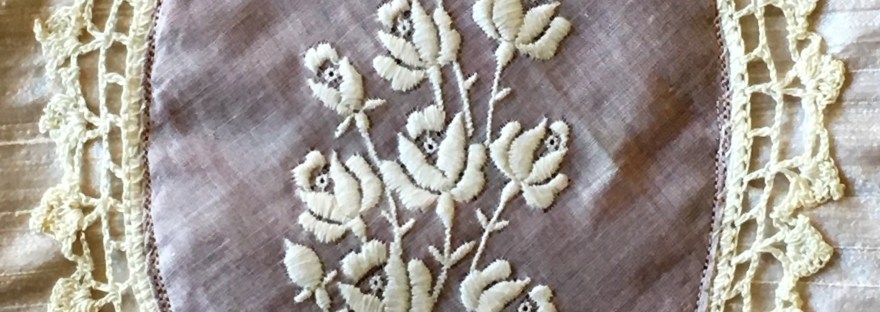I have several vintage handkerchiefs that have lovely lace on them. I wanted to use a couple of them in making a reticule to go with my gown for the ball at the JASNA Annual General Meeting in September. The gown is of a cranberry-color cotton and the over-dress is a blush-color dupioni silk. I had one handkerchief that had roses embroidered on a corner and I thought that would be perfect for a reticule as a center applique. I had another linen handkerchief with crocheted lace (cotton, I think) for a nice lace border decoration. I planned to use the blush color silk for the body of the bag.