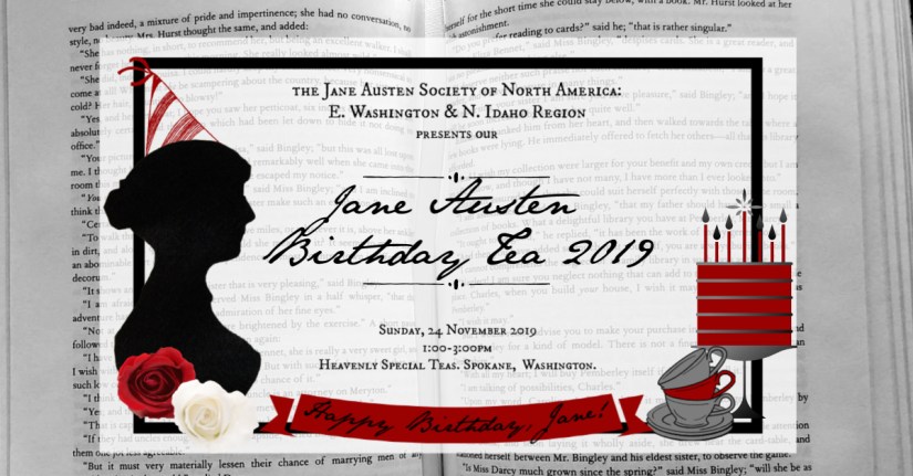 Our Jane Austen Birthday tea on Sunday November 24 was such fun. We had the event at Heavenly Special Teas in Spokane. The food was delicious, and the holiday decorations were a delight. We raised funds for our region through a raffle of items such as Regency bonnets, basketball tickets, tea cups, books, a Jane Austen advent calendar, and other Jane Austen-related items. Thank you to all the members who donated items for our fundraiser: Debra P., Yvette T., Chuck P., Anne H., Cassandra B., Sara T., Roseann T., Colleen D., Vickey B., Michele L., and anonymous. Jane Provinsal took all the pictures (see the Photos of Past Events page for the pictures) and made cinnamon ornaments of a Regency man (Mr. Darcy perhaps?) that was the party favor. We also had the premier dramatic reading of “Jane Austen’s Juvenilia: Wicked Funny”, adapted by Michele Larrow. There were three acts from “The Three Sisters”, “Jack and Alice”, and “Love and Freindship”. The members who read were dramatic and funny. Thank you to our readers: Chris, Colleen B., Chuck, Yvette, Sara, Debra, Colleen D., Melody, Diana, Cassandra, Amy, and Michele. The video below is most of the first act from “The Three Sisters” (the very beginning was cut off).