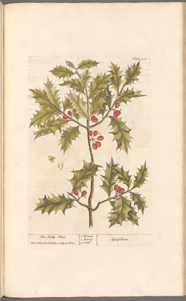 The botanical holly image is from: Blackwell, Elizabeth. A Curious Herbal Containing Five Hundred Cuts of the Most Useful Plants which are Now Used in the Practice of Physick Engraved… by Elizabeth Blackwell…. United Kingdom, John Nourse, 1737-39/1751. Manuscripts and Archives Division, The New York Public Library. “The holly-tree” The New York Public Library Digital Collections. 1751. https://digitalcollections.nypl.org/items/4cd765a0-fce0-0136-c20a-2f5c61a15dd6. Thanks to Joan Dynes Reynolds for alerting me to this print.