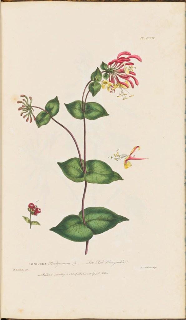 The honeysuckle print is from: Miller, Philip (author) and Ehret, Georg; Lancake, Richard; Miller, R; Thorp, Charles, (illustrators) Figures of beautiful, useful, and uncommon plants described in the gardeners’ dictionary : exhibited on three hundred copper plates … to which is added, an account of the classes and orders to which they belong, according to Linnaeus’s method, Vol 1, Image 81/Plate 74, online through Auckland, NZ Libraries Heritage Collections: https://discover.aucklandlibraries.govt.nz/search/card?recordId=1972346. This book was also owned by Austen’s brother Edward Austen Knight.