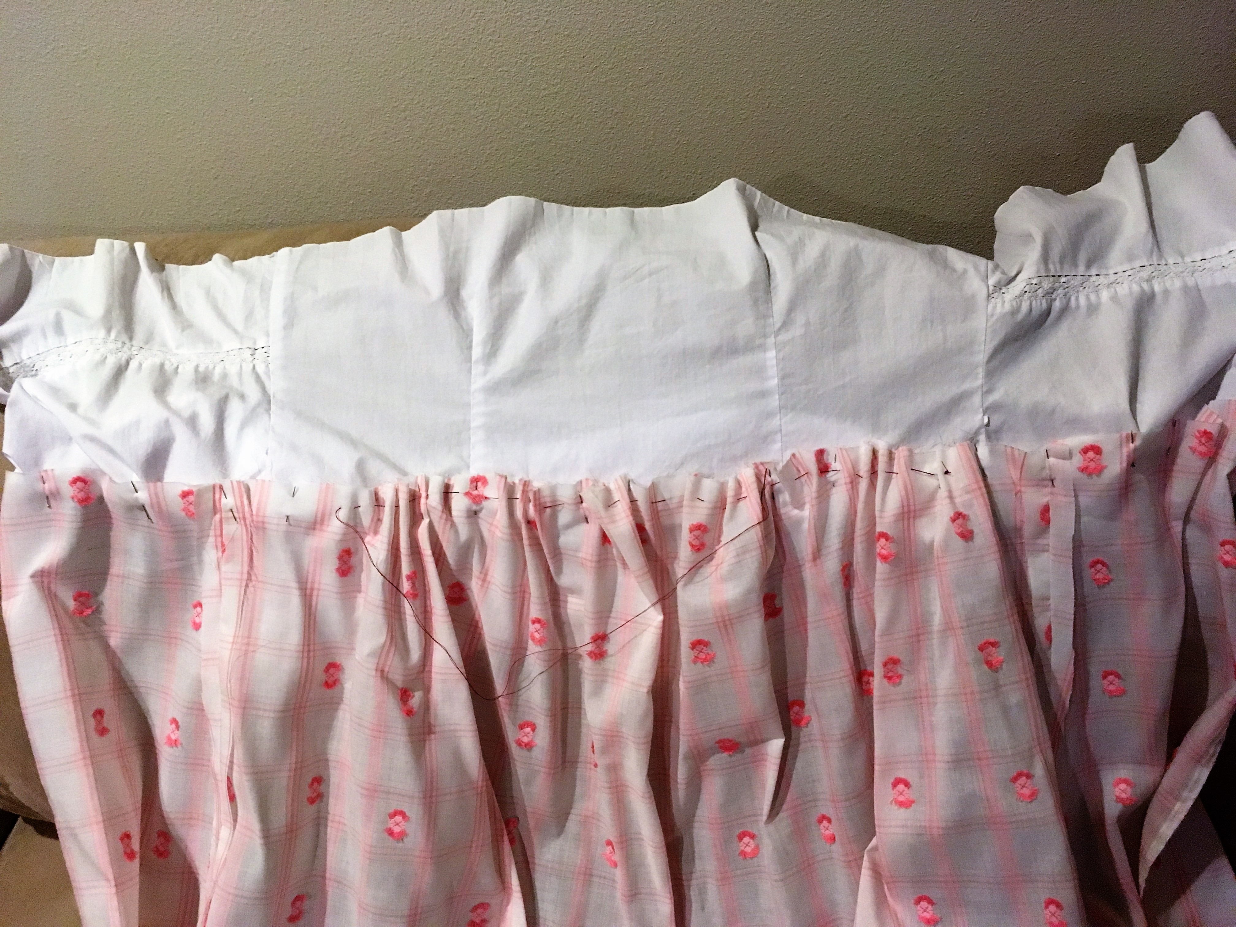 For my under-dress, I have a sleeveless full-length lined silk petticoat with a drawstring neckline that I had already made for a previous outfit. Both the top and the bottom of the over-dress had to be gathered some—the top just a little bit and the bottom quite a bit to create the gathered back. I sewed the bottom sides together and pressed the seams open, then sewed a small hem along the front opening and the bottom (using the sewing machine). I basted the back as instructed in the pattern to create gathers and then pinned the right side of the shirt to the right side of the bottom of the dress, gathering the shirt slightly below the bust. I basted the shirt and bottom together before cutting off the lower part of the shirt to make sure that the fit was correct.