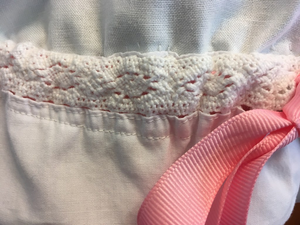 Once I was sure that the size was correct, I trimmed the lower part of the shirt and then used the sewing machine to sew the basted high waist. To give the high waist seam some reinforcement, I covered over the raw edges with the seam allowance of the cotton shirt (which I left a little longer) and then sewed that down to the top through all layers about ¼” from the waist seam. I made belt loops out of the pink ribbon I was using for the belt (hand sewn after folding in thirds) and then basted and sewed them on the seam of the bottom of the dress and straight up on the shirt. The dress was a little large around the empire waist, but cinched nicely with the ribbon belt (1 ½” grosgrain ribbon). I left the plastic buttons on the top because I was not able to find anything more authentic looking that was small enough for the button loops.