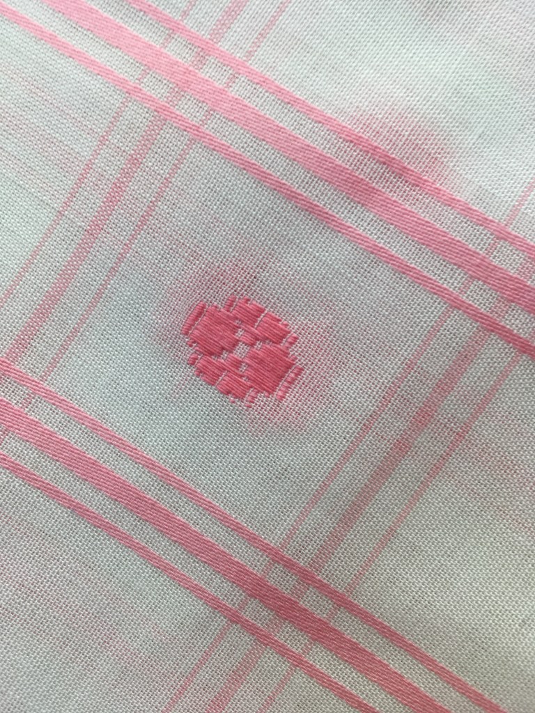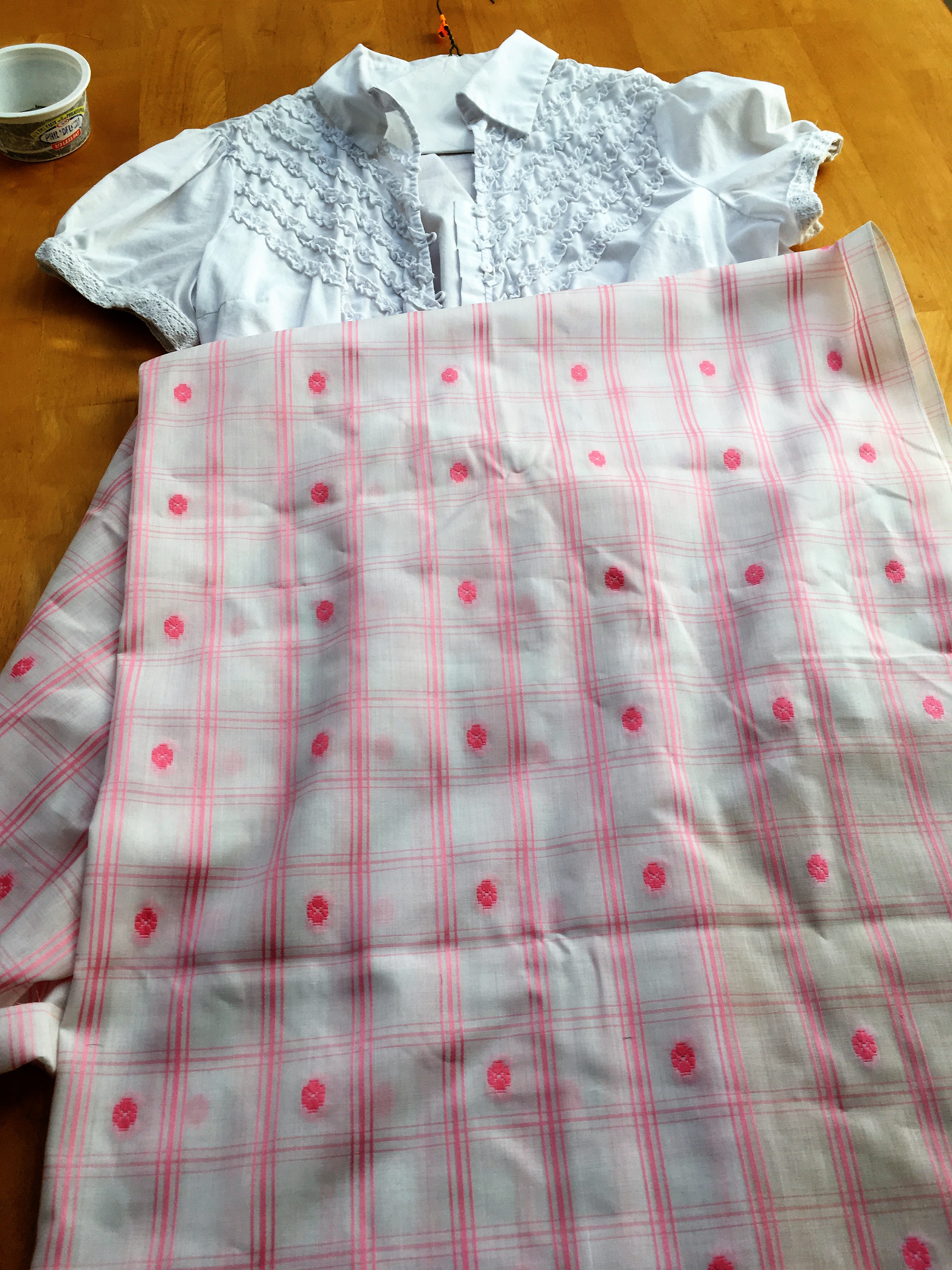 To create the over-dress, I used a short-sleeve white cotton shirt I had with ruffles sewn onto the top in a diagonal pattern. The bottom of the dress was made out of some white shirting fabric that I found at a second-hand store with a pink window-pane pattern with a pink medallion in some of the squares. It was rather sheer, but had good body. I cut the bottom using my trusty Simplicity #4055 (Sense and Sensibility) pattern, putting the front panel on the selvedges instead of the fold to create a front opening. I cut the length a little shorter than full-length, but longer than the overlay pattern that comes with View A of the Simplicity pattern.