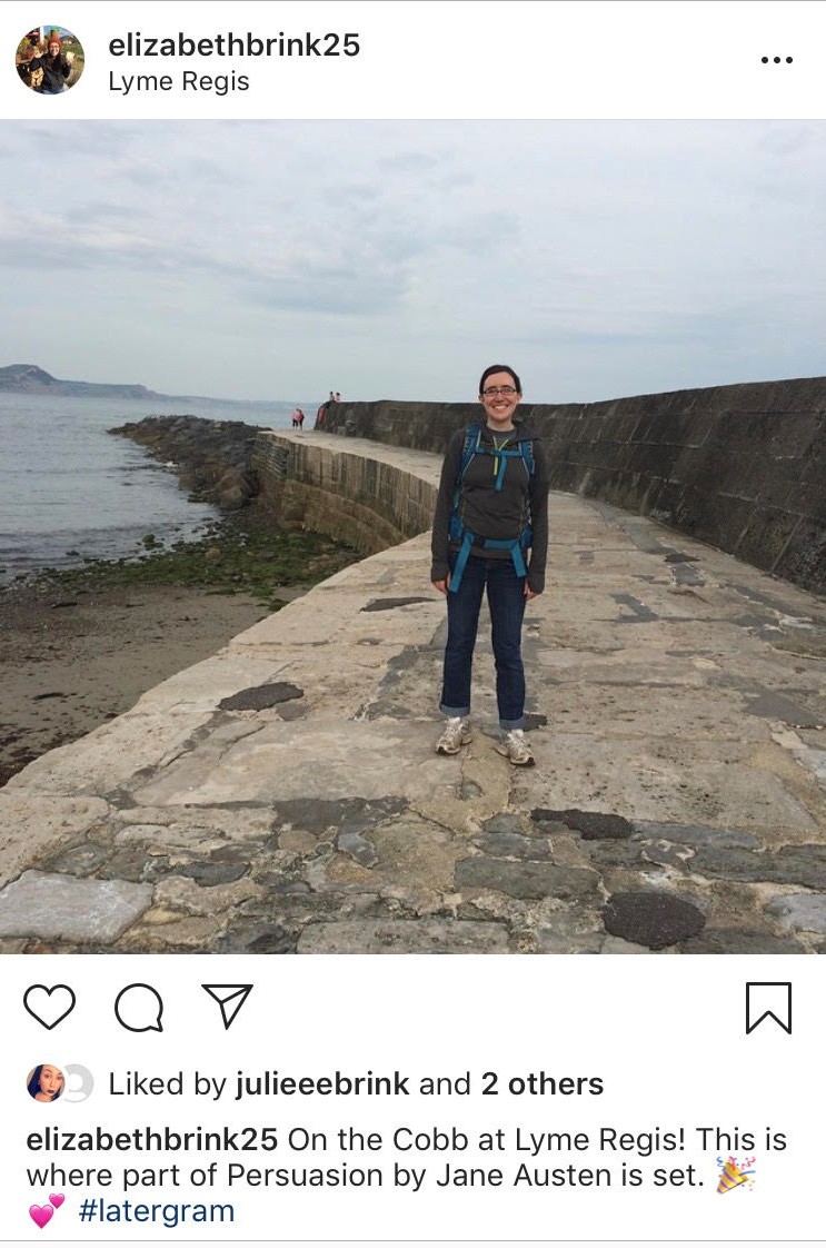 Special Jane Austen items in your in collection? A picture of me on the Cobb in Lyme Regis pretending to be Louisa Musgrove, though not actually falling! (Editor’s note: a screenshot of the photo with caption and location is featured above!)