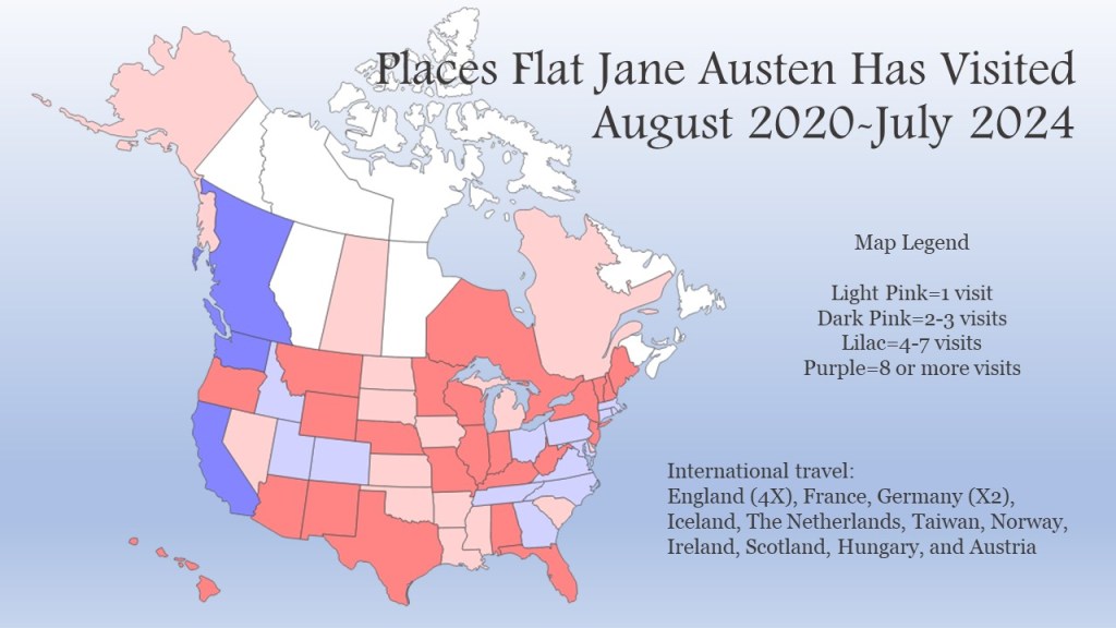 Anne S. goes skating in Pittsburgh, PALisa A. Atlanta, GA: Helen GA Bavarian VillageAnne S. Morgantown, WV: Pearl Harbor CeremonyMihaela H. Gif sur Yvette, France: The Eiffel TowerMeghan T. goes to Iceland: Puffins!Deanna H, Navarre, FL: SeashellsRose T. in AZ: A Mule Ride down the Grand CanyonKirk C. goes to RI: The RI State HouseMeghan T, Wells, ME: Maine LighthouseJen D., Paducah, KY: The Ohio RiverChristina B., Custer, WA: Larrabee Park Chuck P. Spokane, WA: The top of Mt. Spokane looking to IdahoLorraine M. New Westminister, B.C.: Nanaimo HarborRose K, Scituate, MA: Massachusetts LighthouseKirk C. goes to Alexandria, VA: MarinaMelanie D, Coeur d’Alene, ID: Halloween in SeattleDeana H., Delaware, OH: Pyramid Sculpture GardenRose T. goes to Chicago: Deep Dish Pizza!Kirk C. goes to Harpers Ferry, WV: The Appalachian TrailNancy M. Vancouver, B.C.: FJA goes to a ballKarin N, The Netherlands: in AmsterdamPenny I. Bath, UK: Georgian-style private gardenNancy M. Warren, MI: Buddy’s Detroit Style PizzaRenata D. Avondale Estates, GA: Atlanta SkylineSara T. goes to Maui Hawai’iHeidi T. Enfield, CT: Tea TreatsHeidi T. goes to Brattleboro, VTRandy B. Savannah, GA: St. Pat’s Day ParadeRandy B. goes to South Carolina for a JASNA SC meetingEmily B. Fairhope, AL: Alabama State CapitolJennifer J. Bel Air, MD: JASNA MD meetingQN Pooh Bear Pawtucket, RI: Slater Textile MillAmelia R. Hamilton, NJ: Watching JeopardyJeanette W. goes to DelawareJeanette W. goes to Ft. McHenry, MDJeanette W goes to Virginia: Fort MonroeJeanette W goes to Indiana: Indy Speedway!Jeanette W goes to Wisconsin: Cheese!Jeanette W, Champaign, IL: Fannie Mae CandiesJeanette W goes to TennesseeJeanette W. goes to Valley Forge, PAKirk C. goes to Durham, NHJill M., Carpenter, WY: Cheyenne ParadeKirk C. goes to Maine: Old Orchard BeachDarby W. Reno, NV: Lake TahoeKirk C. goes to Washington, DC: CapitolJeanette W. goes to KentuckyJeanette W. goes to Winston-Salem, N.C.Jeanette W. goes to Tamarack, WVJeanette W. goes to a Victorian Ball in Cincinnati, OHBecky M, Kansas City, MO: Neptune Fountain