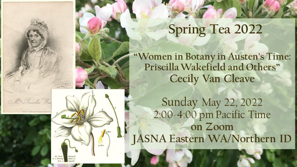 May 22, 2022 Spring Tea “Women in Botany in Jane Austen’s Time: Priscilla Wakefield and Others” Cecily Van Cleave (on Zoom; video not available)
